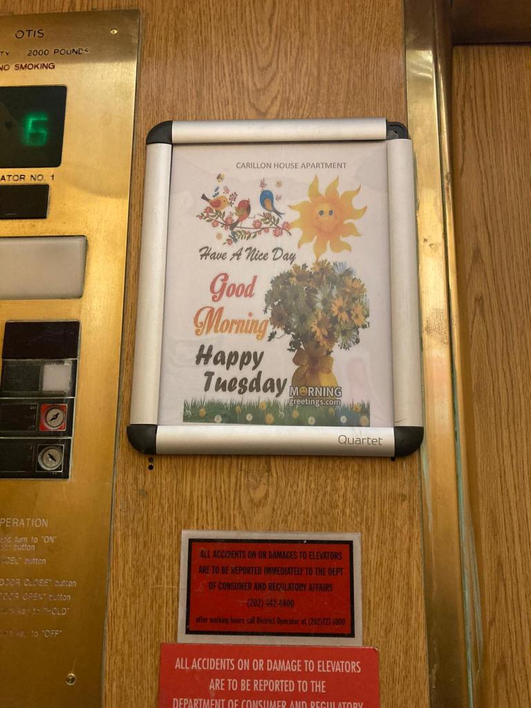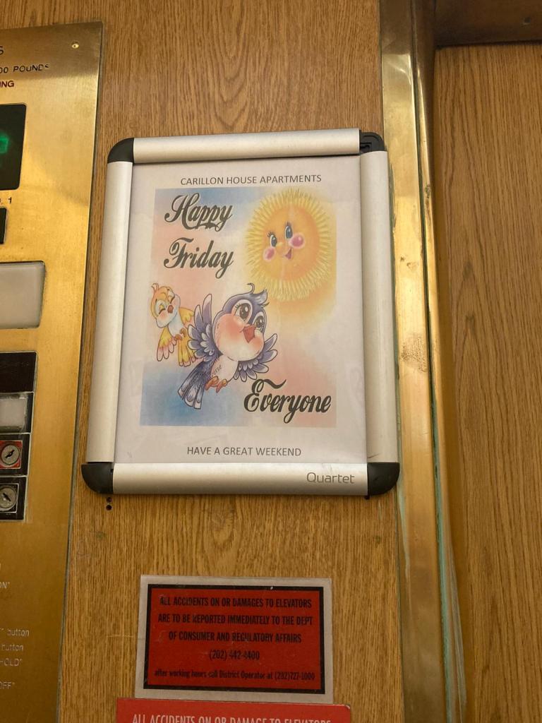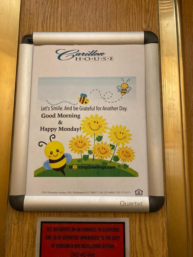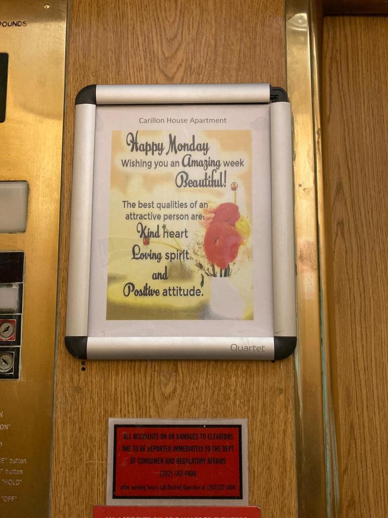 Quand je prends l’ascenseur dans mon immeuble, il y a une petite affiche à l’intérieur, avec une maxime qui change tous les jours…Maximes dont je vous laisse apprécier la profondeur.