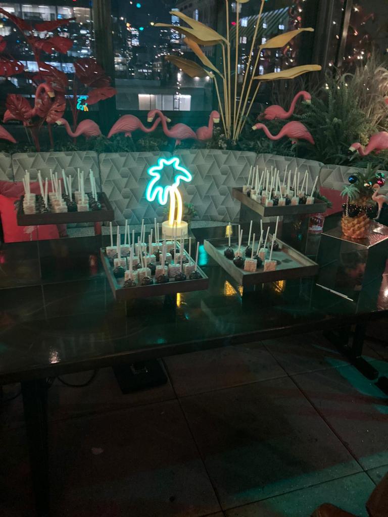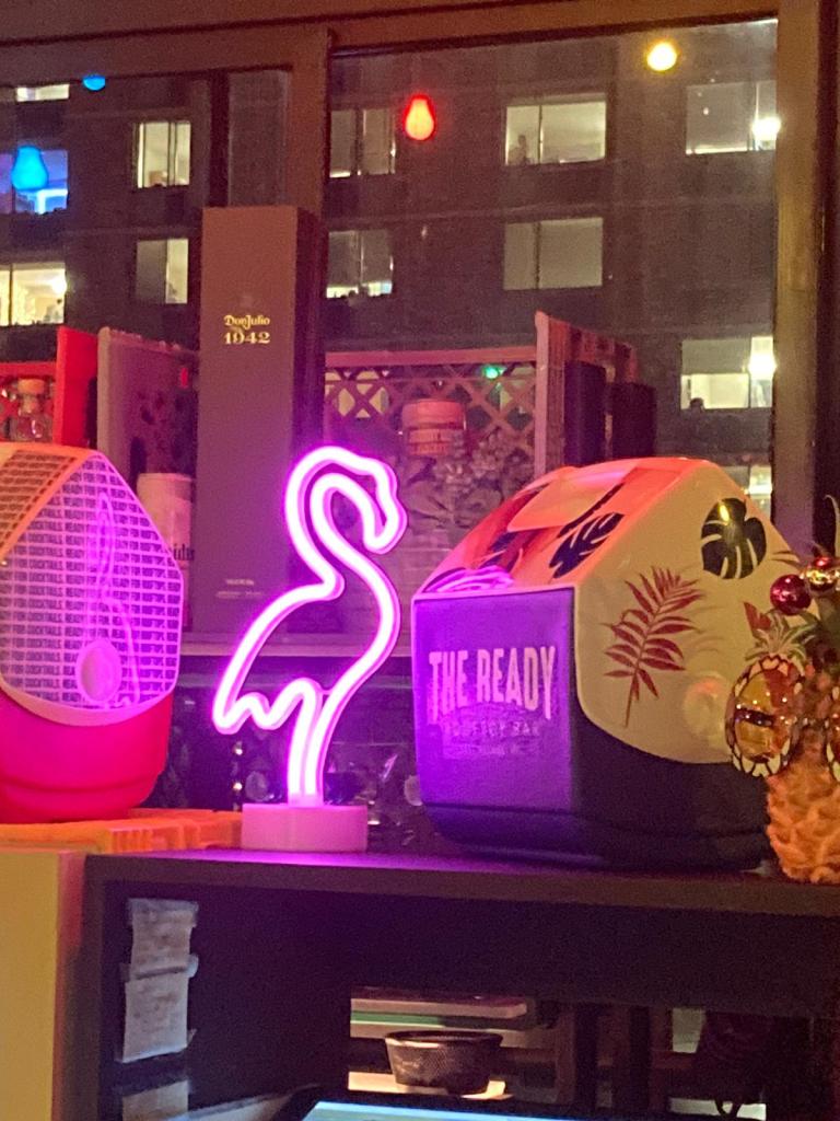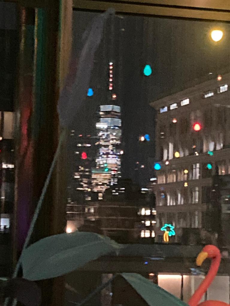 Le décor est comment dire…ambiance Noël mais…Noël à Miami…il y a des flamands roses partout et de la musique techno. La vue est fantastique, on voit tout New-York iluminé.